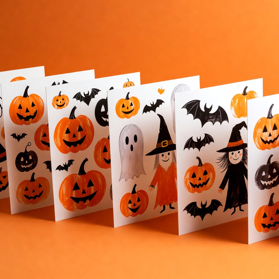 A row of white greeting cards featuring Halloween illustrations stands against an orange background. The cards display carved pumpkins with smiling faces, black bats, friendly ghosts, and cartoon witches in red and black dresses holding hands. Each card has colorful hand-drawn Halloween motifs scattered across the surface.
