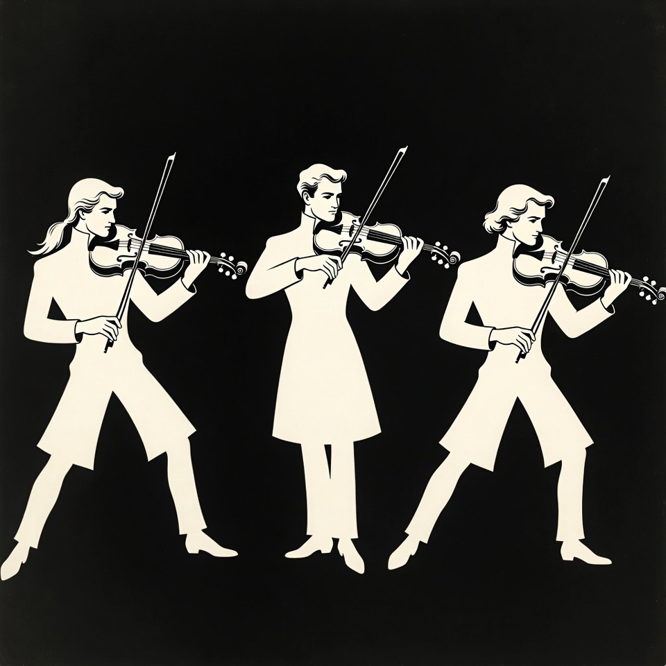 Three men in long white coats play violins in a black and white silhouette illustration. They stand side by side with long hair, holding bows poised on the instruments. The figures are isolated against a solid black background.