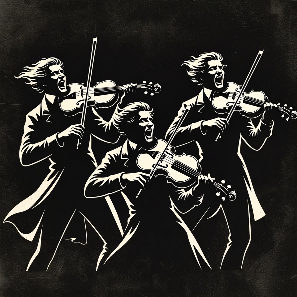 A black and white illustration depicts three men passionately playing violins on a dark background. They wear formal suits with long flowing hair and dynamic poses, mouths open as if singing or shouting. The artwork uses bold line art in a vintage style.