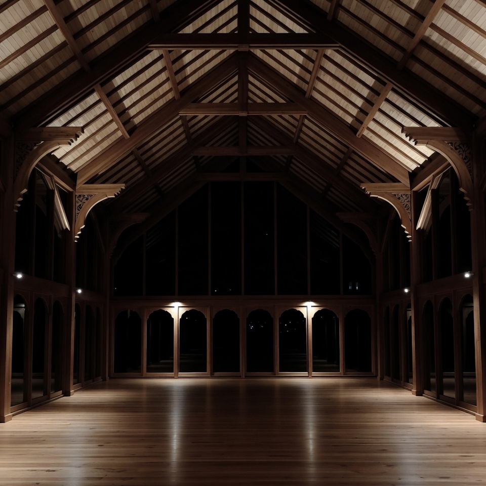 arched windows, barn hall, beamed ceiling, cathedral ceiling, empty hall, exposed beams, grand hall, high ceiling, interior architecture, intricate carvings, polished floor, rustic architecture, soft lighting, spacious interior, timber beams, vaulted ceiling, wooden architecture, wooden floor, wooden panels, wooden ceiling