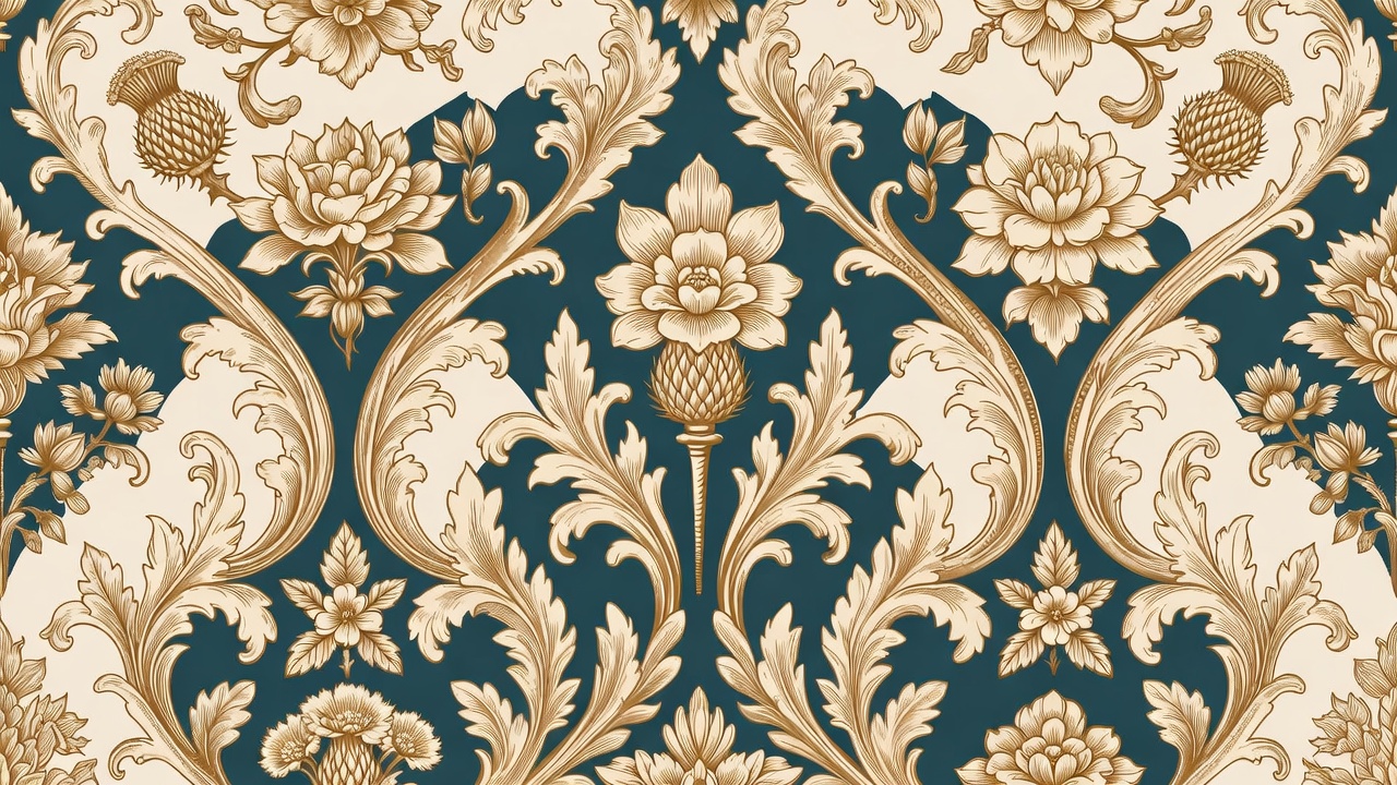 artistic wallpaper, baroque motif, classic pattern, decorative paper, elegant design, floral design, floral motif, floral scroll, gold filigree, gold pattern, gold thistles, intricate pattern, luxury decor, luxury wallpaper, navy background, navy damask, ornate wallpaper, repeating wallpaper, scrollwork, symmetrical design, thistle flower, thistle plant, victorian pattern, vintage wallpaper, wall covering, wallpaper pattern, damask wallpaper
