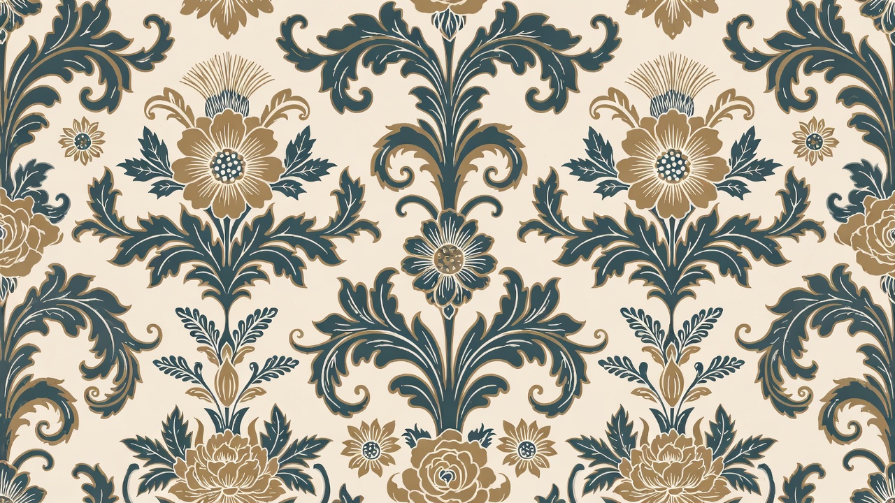 arabesque pattern, baroque design, cream background, damask pattern, decorative motif, elegant pattern, fabric pattern, floral motif, gold flowers, gold navy, illustration, intricate details, luxury texture, navy blue, ornate leaves, rococo style, rose flowers, seamless wallpaper, swirling stems, symmetrical design, thistle flowers, vector art, victorian style, vintage floral, wallpaper design, floral pattern