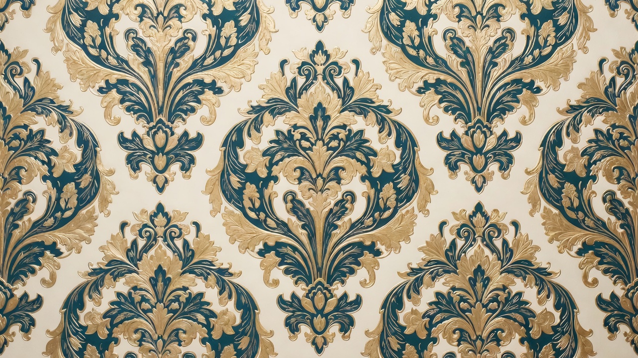 A seamless wallpaper features an intricate damask pattern in gold and teal colors. Ornate floral and scroll motifs repeat across a cream background. The elegant design creates a luxurious baroque texture.