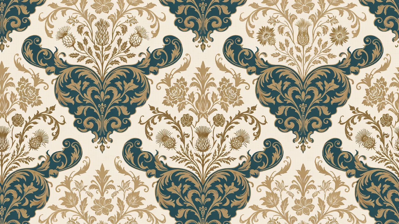 Victorian wallpaper, baroque style, botanical pattern, cream background, cream wallpaper, damask pattern, decorative wallpaper, elegant design, filigree details, floral design, floral motif, floral wallpaper, gold accents, gold filigree, heart motifs, intricate details, luxury wallpaper, navy blue, navy gold, navy pattern, ornate pattern, repeating pattern, seamless texture, symmetrical design, thistle flowers, thistle illustration, thistle plant, vintage pattern, wallpaper texture, wallpaper pattern