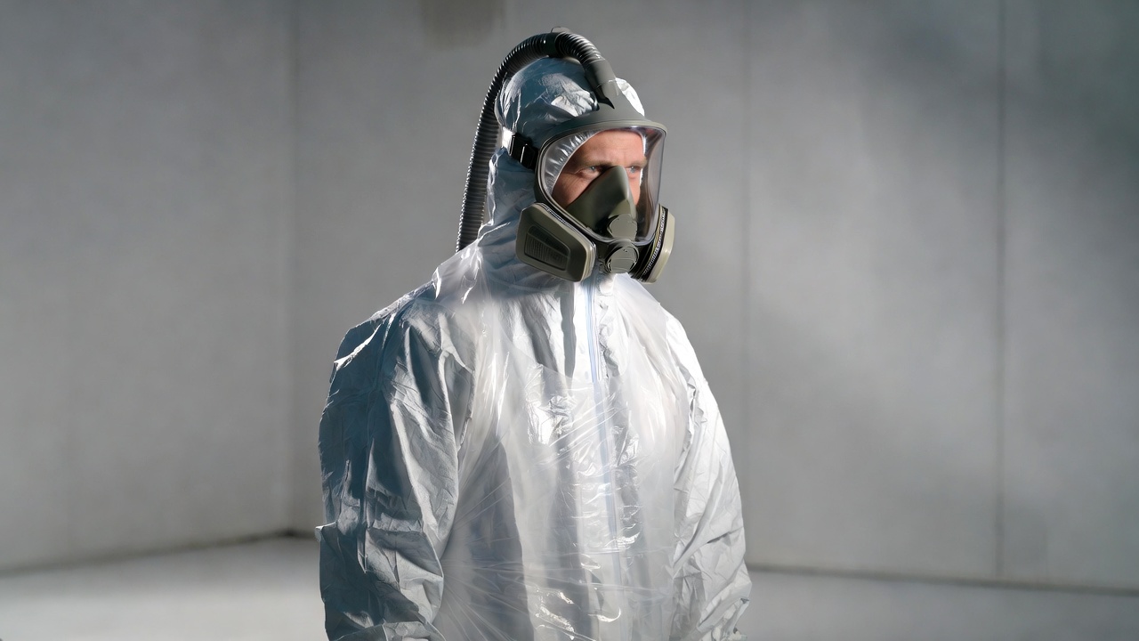 A man stands in a white hazmat suit with a full-face respirator mask and breathing hose. He faces forward in a plain gray room with smooth walls. The protective gear covers his body completely.