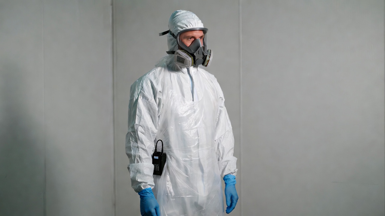 A man stands wearing a full white hazmat suit, gray respirator mask, and blue gloves against a plain gray background. The suit includes a hood and a device clipped to the waist. He faces forward in protective gear.