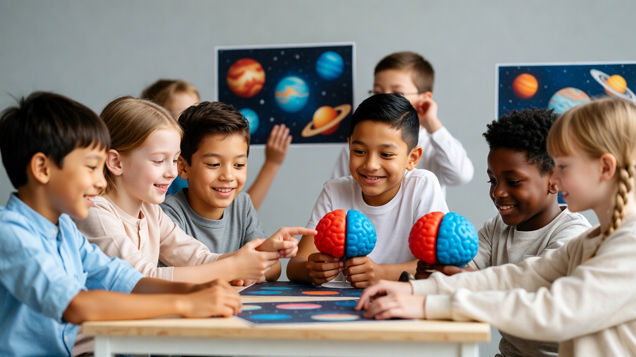 A diverse group of young children sits around a table in a classroom, excitedly playing with red and blue foam atom models. They point and hold the split molecular structures while space posters decorate the background walls. The kids wear casual clothes and engage collaboratively at the wooden table.