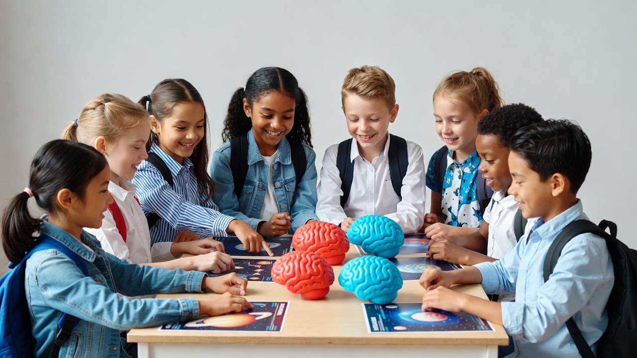 A diverse group of eight children sits around a table examining colorful brain models and educational mats. They wear school uniforms with backpacks and point at red and blue plastic brains. The children include boys and girls of Asian, African-American, and White ethnicities in a bright classroom setting.