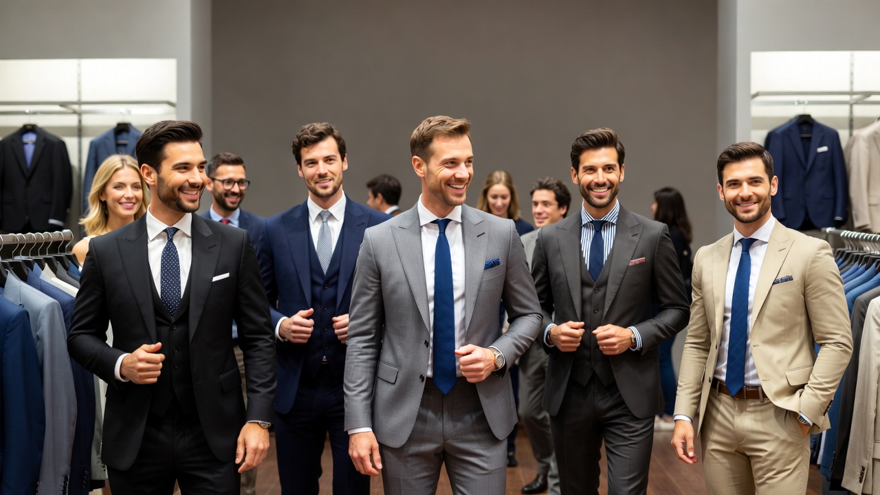 White, beige suit, black suit, business attire, clothing store, confident men, formal wear, gray suit, group of men, indoor, male, mannequins, modern store, navy suit, posing, retail store, standing, stylish men, suits, suits rack, men