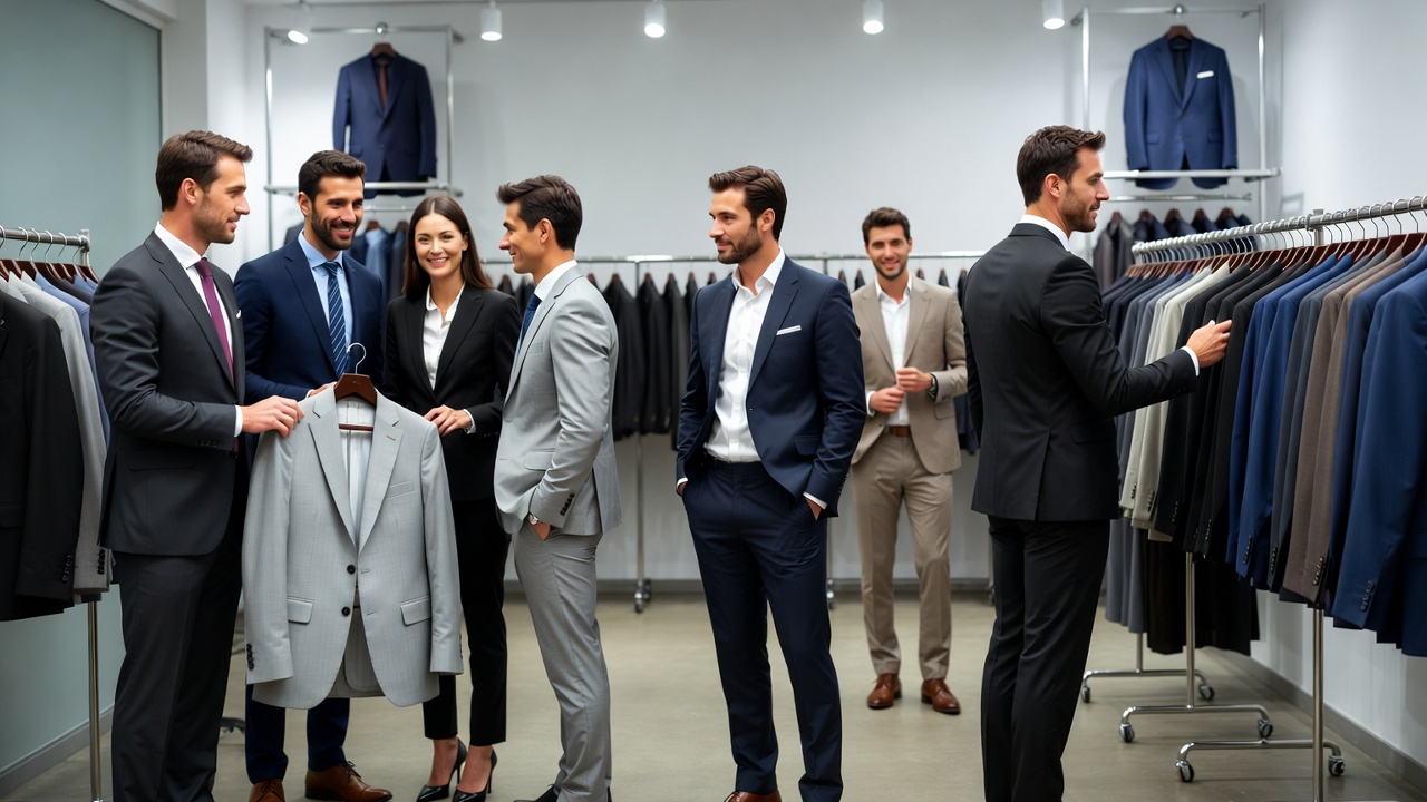 A diverse group of men and women in business attire stands together in a modern clothing store, examining suits hanging on racks. They wear suits in navy, gray, beige, and black, with some holding garments while others point and discuss options. The well-lit space features clothing rails and display suits on mannequins against a clean backdrop.