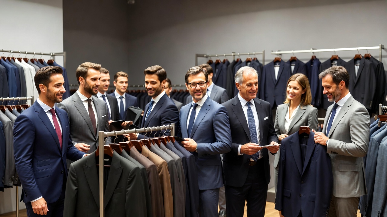 A diverse group of about 12 professionals, mostly men in suits with one woman, stands together in a modern clothing store examining suits on clothing racks. They hold and inspect various suit jackets in shades of navy, gray, and black. The setting features metal clothing rails and a neutral gray interior.