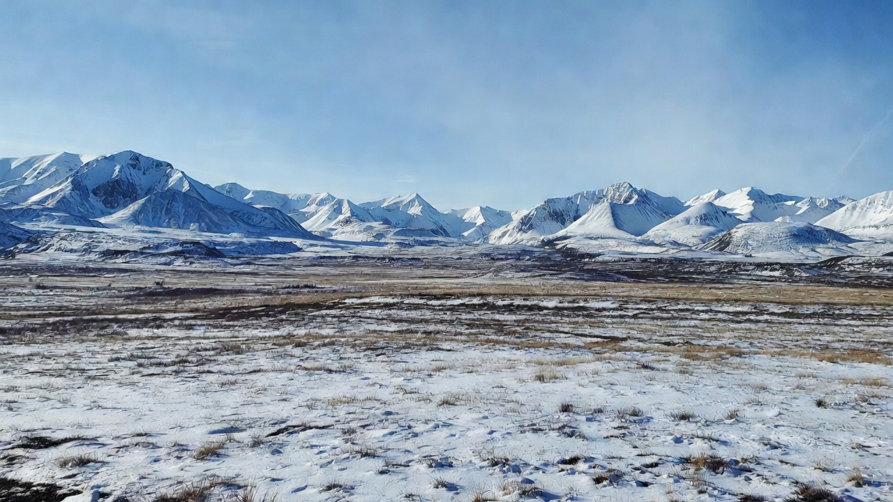 alpine mountains, blue sky, brown grass, clear sky, cold weather, distant mountains, frozen landscape, jagged peaks, mountain range, mountain vista, nature, outdoors, panorama, plain landscape, snow covered peaks, snowscape, snowy plain, tundra, vast plain, white snow, winter landscape, winter scenery, snowy mountains