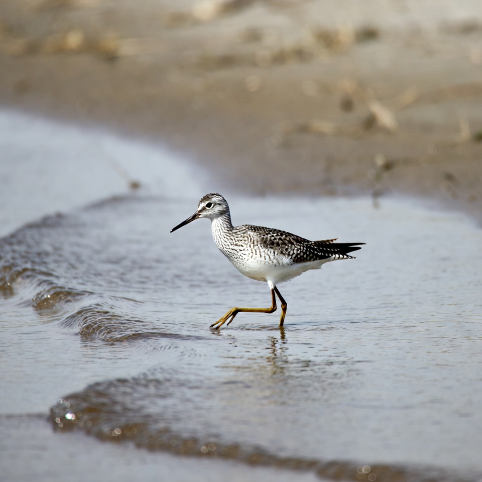 beach, bird, coastal bird, foraging bird, gray bird, nature, ocean waves, sand, sandpiper, shorebird, spotted feathers, wading bird, wet sand, wildlife, yellow legs, semipalmated sandpiper