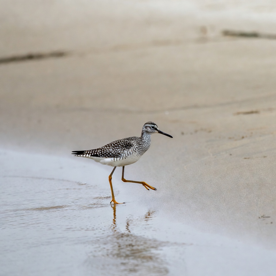 beach, bird, black bill, isolated background, nature, ocean shore, orange legs, reflection, sand, sandpiper, shorebird, speckled feathers, wading bird, wet sand, wildlife, semipalmated sandpiper