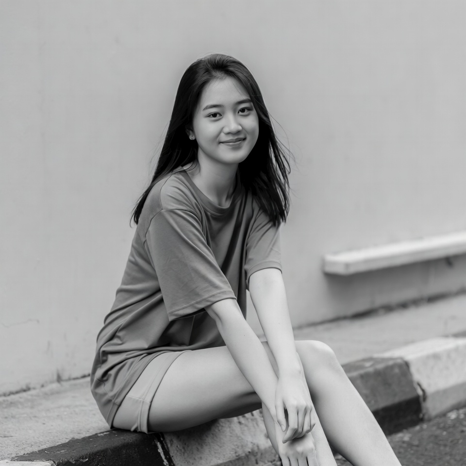 A young Asian woman with long straight hair sits on a concrete curb wearing a loose gray t-shirt and shorts. She smiles warmly at the camera with her hands resting on her legs. The image is in black and white against a plain wall and street background.