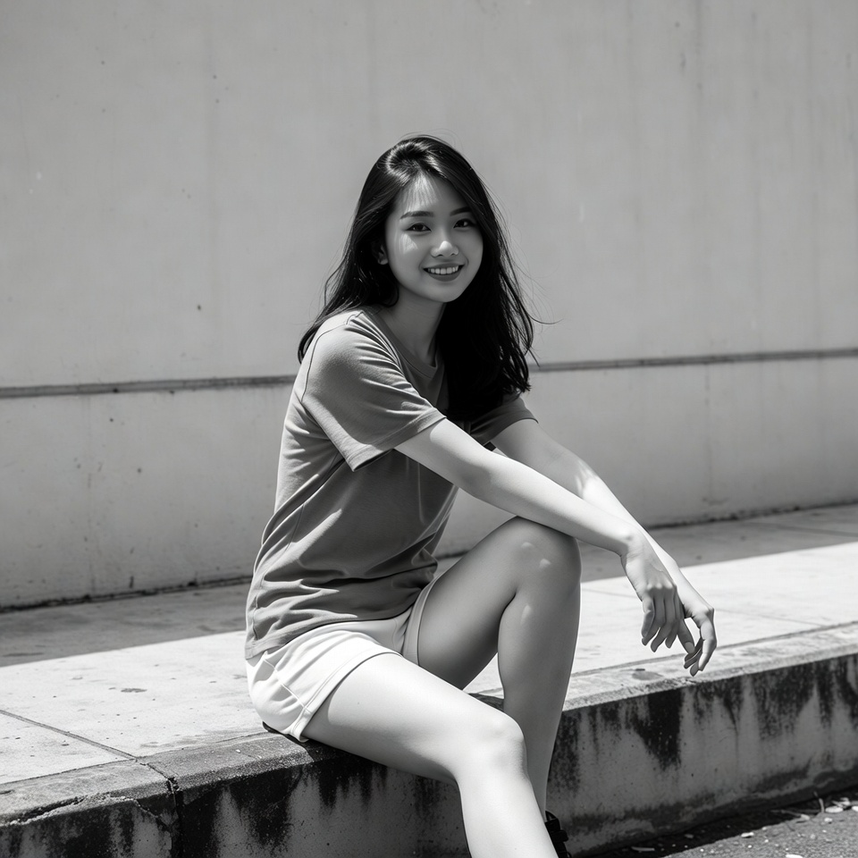 A young Asian woman with long black hair sits on a low concrete ledge against a plain white wall. She wears a short-sleeved gray t-shirt and white shorts, smiling happily at the camera. Her legs are extended forward in a relaxed pose.