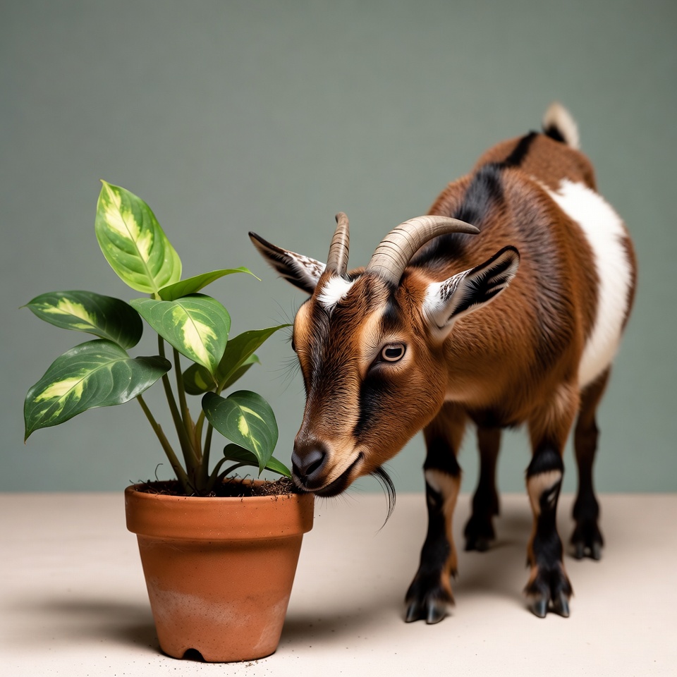 Goat eating potted plant