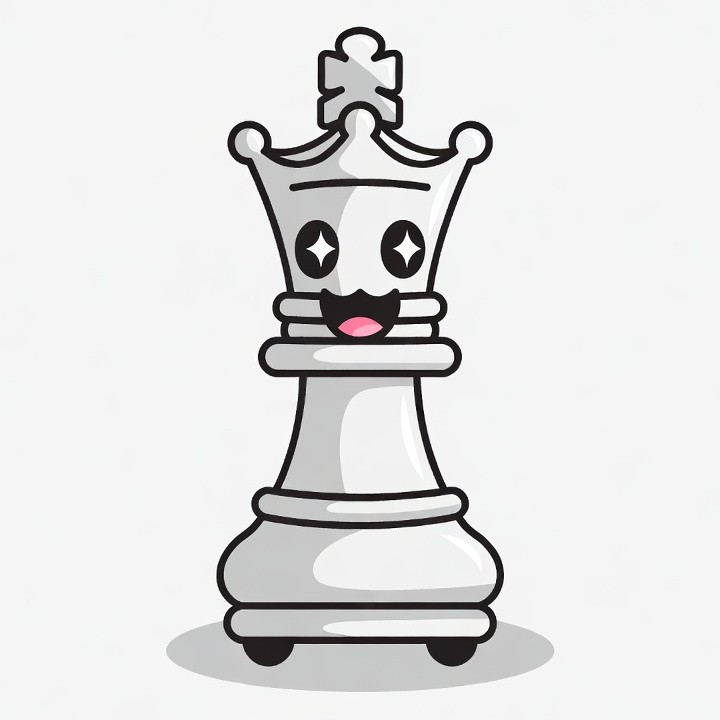 board game, cartoon chess, chess illustration, chess queen, clipart, cute chess, game piece, happy face, isolated background, kawaii chess, smiling chess piece, sparkling eyes, strategy game, vector art, white queen, queen chess piece