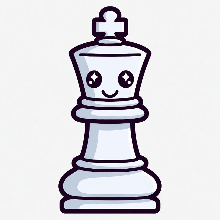 A kawaii-style illustration of a white king chess piece with a smiling face and sparkling eyes. It features a rounded crown with a cross on top and a sturdy base. The design uses bold black outlines on a transparent background.
