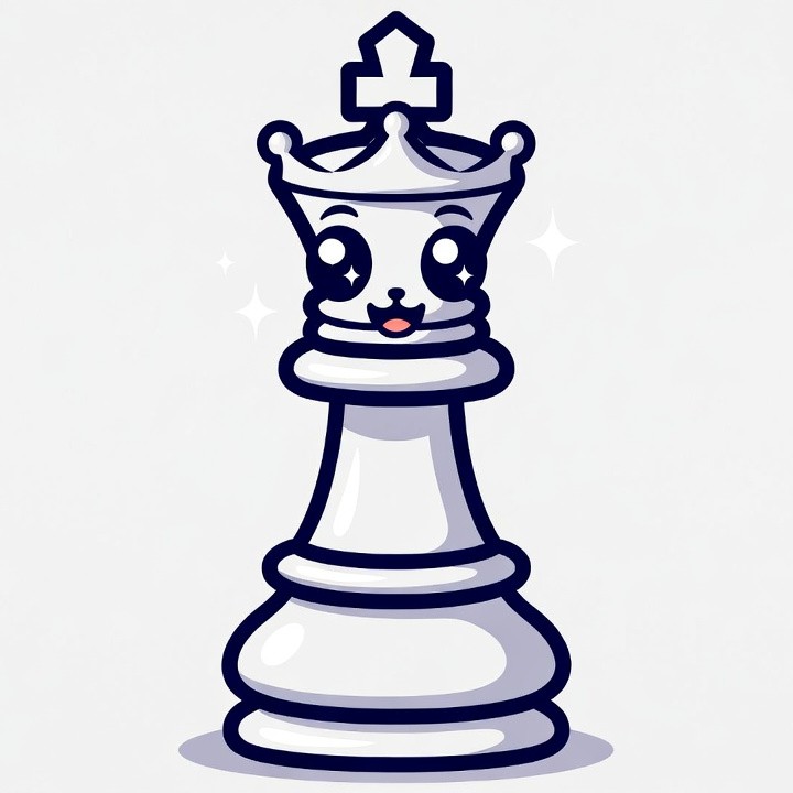 A kawaii-style illustration of a white chess king piece with big sparkling eyes, rosy cheeks, and a smiling mouth. The king wears a detailed crown and stands on a transparent background. It features bold outlines and cute anime-inspired features.