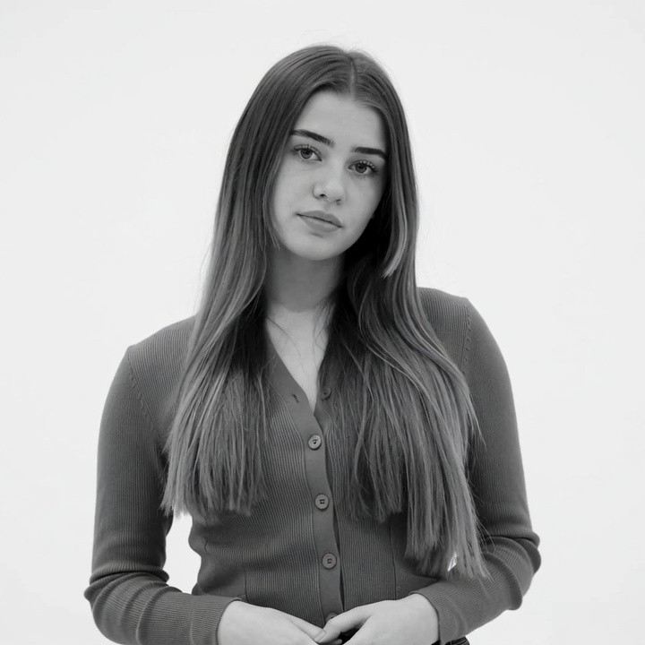 A young woman with long straight hair stands against a white background in a black and white photo. She wears a long-sleeved cardigan with buttons and a subtle necklace. Her expression is neutral as she gazes slightly to the side with hands clasped in front.