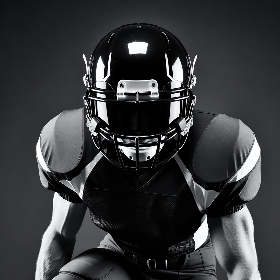 A muscular man wearing a shiny black football helmet and padded uniform crouches on a dark gray background. His face is hidden behind the tinted visor of the helmet, and white accents highlight the shoulders and stripes on his gear. He poses dynamically with arms extended forward.
