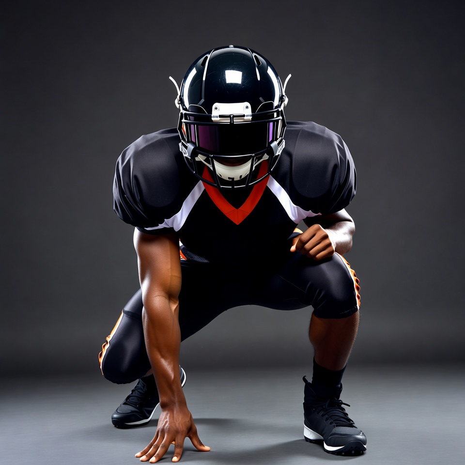 An African-American man wearing a black football uniform and helmet crouches on a gray background. He has muscular arms extended forward with hands on the ground in a ready stance. His visor is tinted purple and the uniform features orange accents.