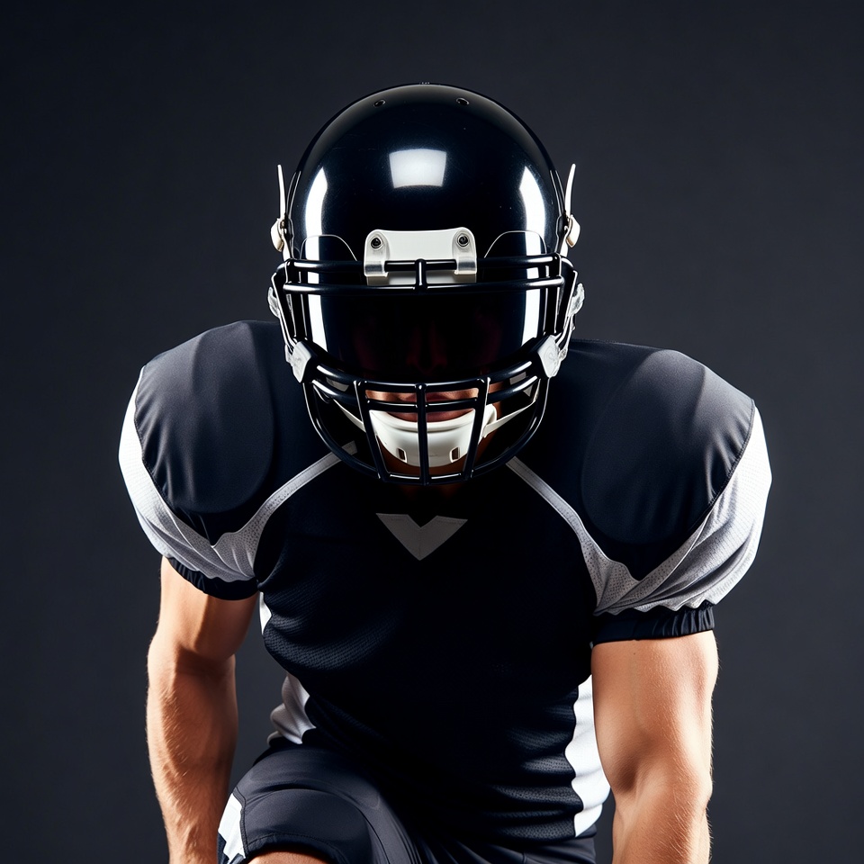 A muscular man in American football gear crouches on a dark gray background. He wears a shiny black helmet with a faceguard and a black-and-white padded uniform. His arms are positioned forward in a ready stance.