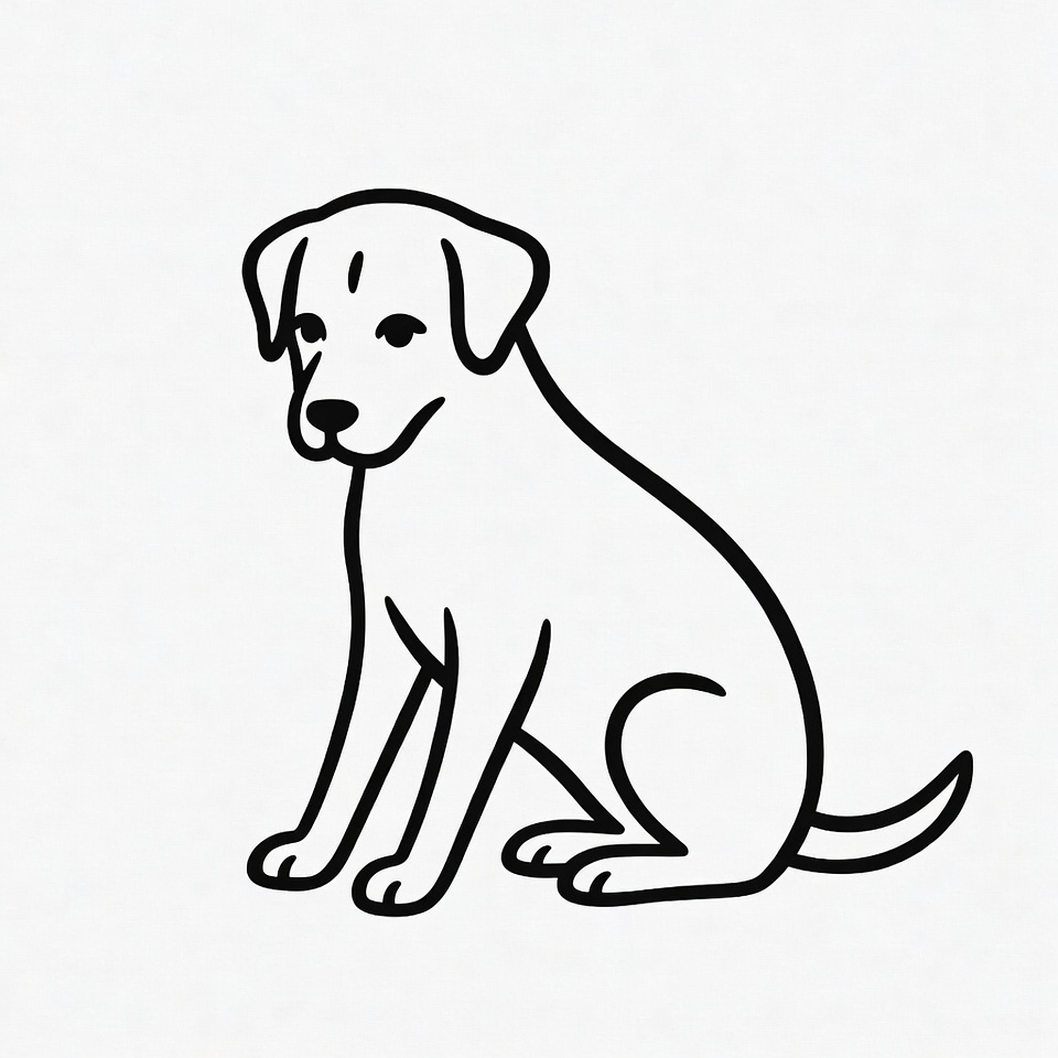 A simple black line drawing of a cute puppy sitting on a white background. The puppy has floppy ears, a happy expression, and a curled tail. It is depicted in a cartoonish clipart style.
