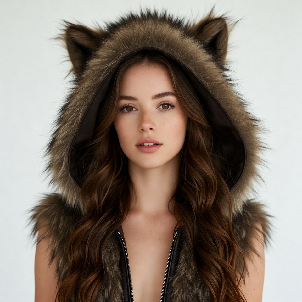 A young woman with long wavy brown hair wears a brown fluffy faux fur hoodie featuring large wolf ears and a zipper front. She stands against a white background with a subtle smile and direct gaze at the viewer. The hood frames her face, emphasizing the animal-inspired design.