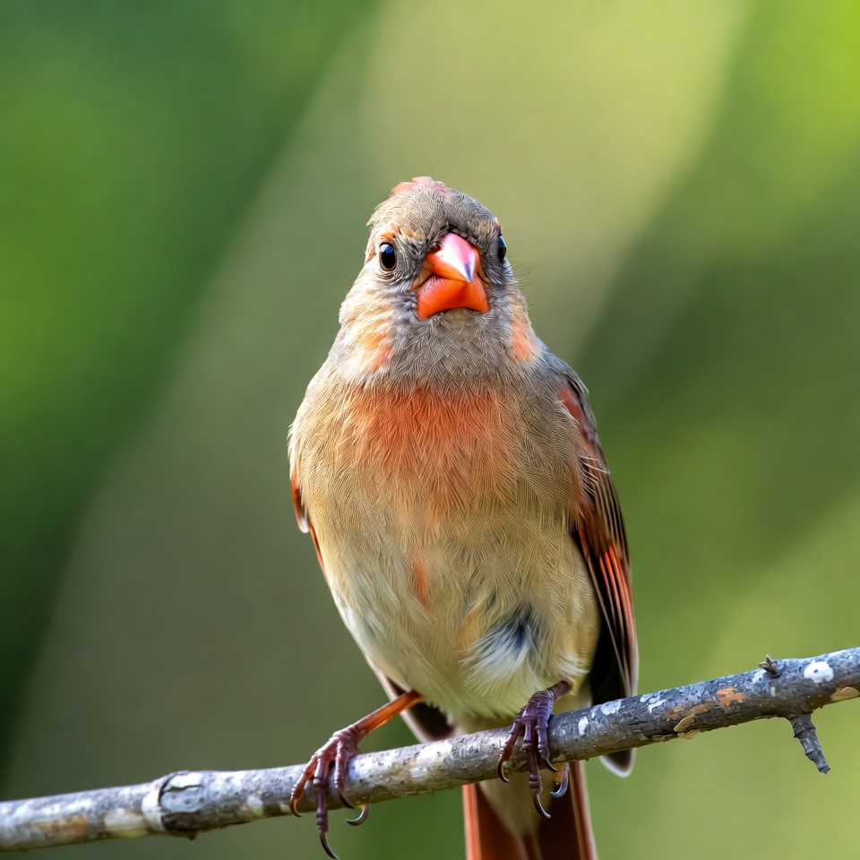 avian, bird on branch, bird portrait, birdwatching, brown feathers, cardinal bird, closeup bird, feathers, female cardinal, nature, orange beak, perched bird, red bird, songbird, wild bird, wildlife, Northern Cardinal