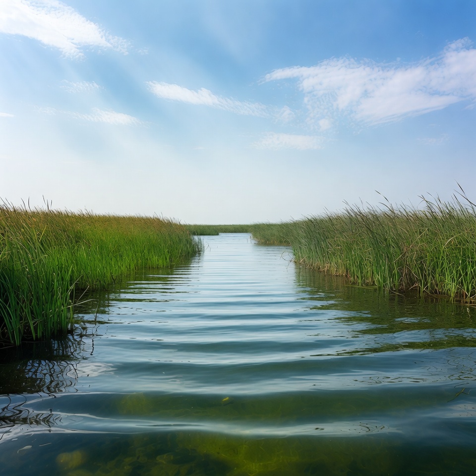 aquatic plants, blue sky, calm water, green grass, landscape, marsh, narrow path, natural scenery, nature, phragmites, reeds, reflection, river, serene, sky reflection, swamp, tall reeds, waterway, white clouds, water channel
