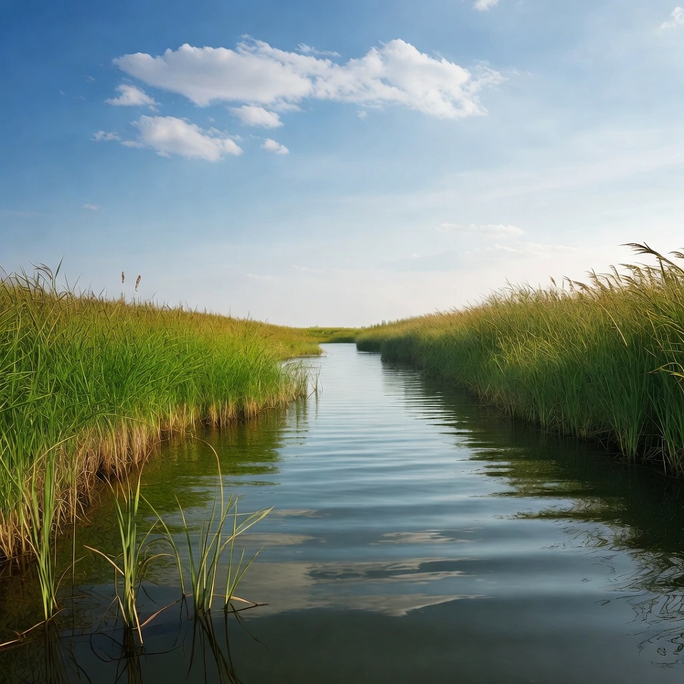 blue sky, calm water, channel, green grass, landscape, marsh, narrow path, nature, outdoors, path, phragmites, reeds, reflection, scenery, serene landscape, tall grass, water, waterway, wetland, white clouds, river