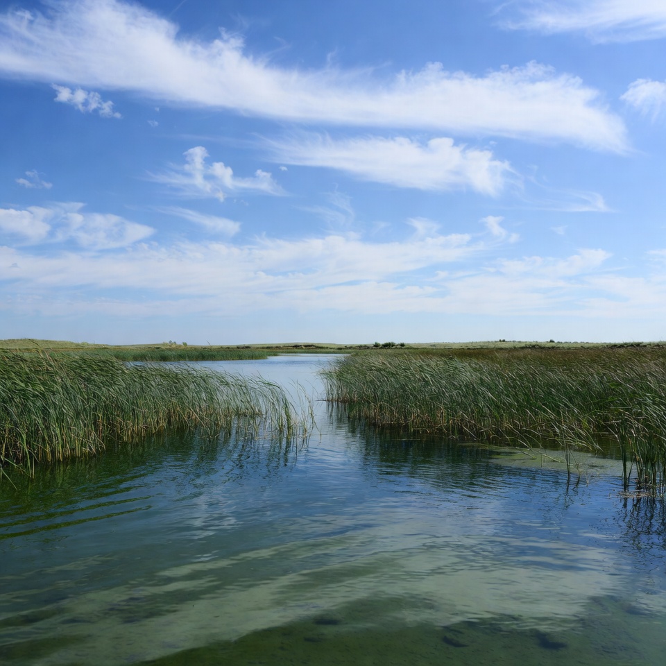 blue sky, calm water, cattails, grasses, grassy marsh, green water, lagoon, landscape, natural scenery, nature, outdoor nature, prairie marsh, reeds, serene landscape, sky reflection, water channel, watery path, wetlands, white clouds, marsh