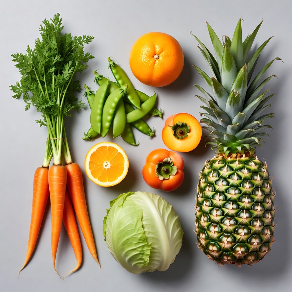 A vibrant assortment of fresh produce is arranged on a light gray background. It includes orange carrots, green peas, parsley, cabbage, orange slices, whole oranges, apricots, bell peppers, and a pineapple. The fruits and vegetables are whole or cut, showcasing their bright colors and textures.