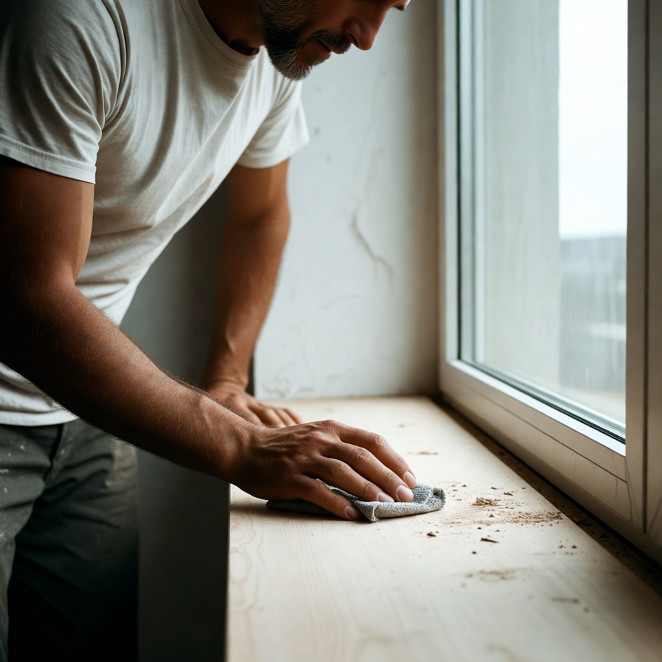 Man sanding wood window sill