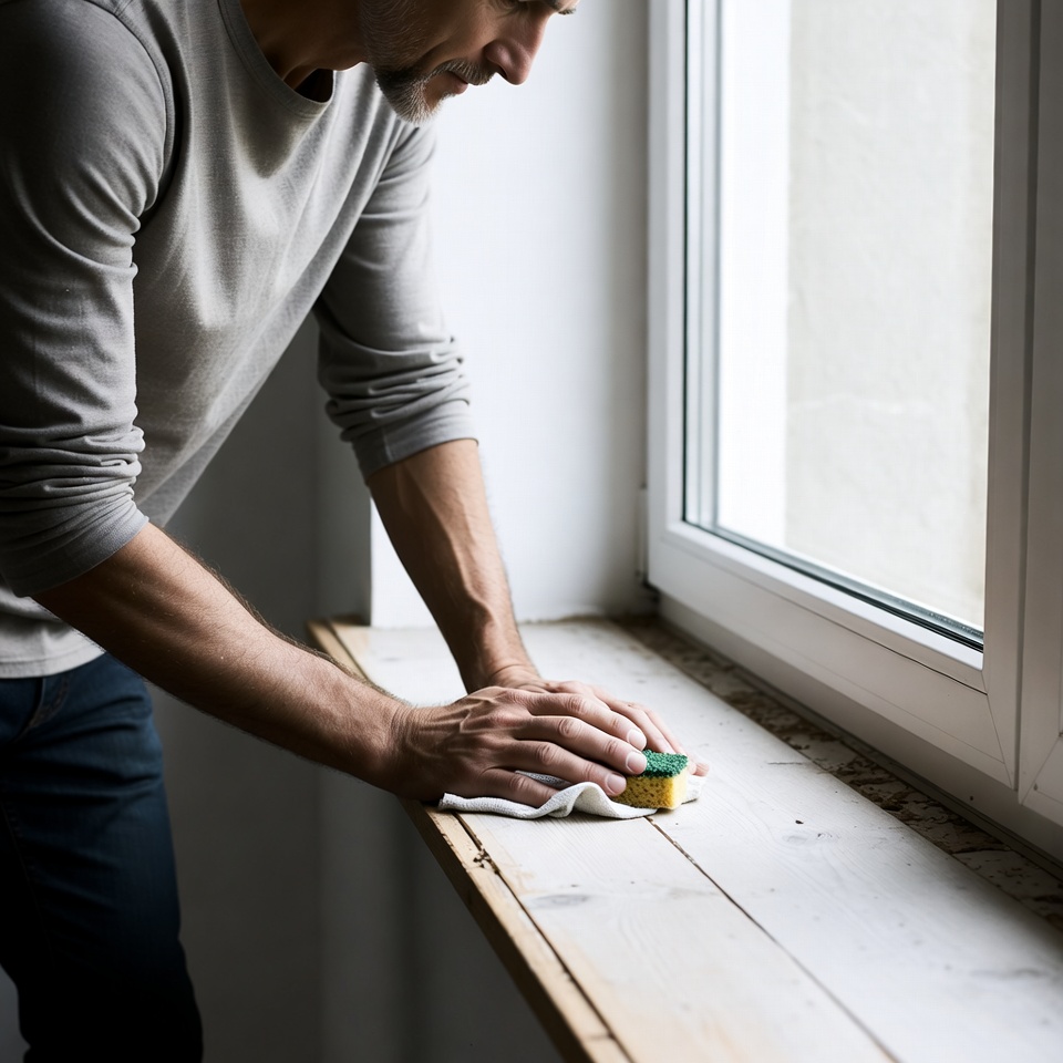 A middle-aged man with a grey beard leans over a white wooden window sill, scrubbing it with a green sponge and cloth. He wears a grey long-sleeve shirt and blue pants. The window features white frames with natural light filtering through.