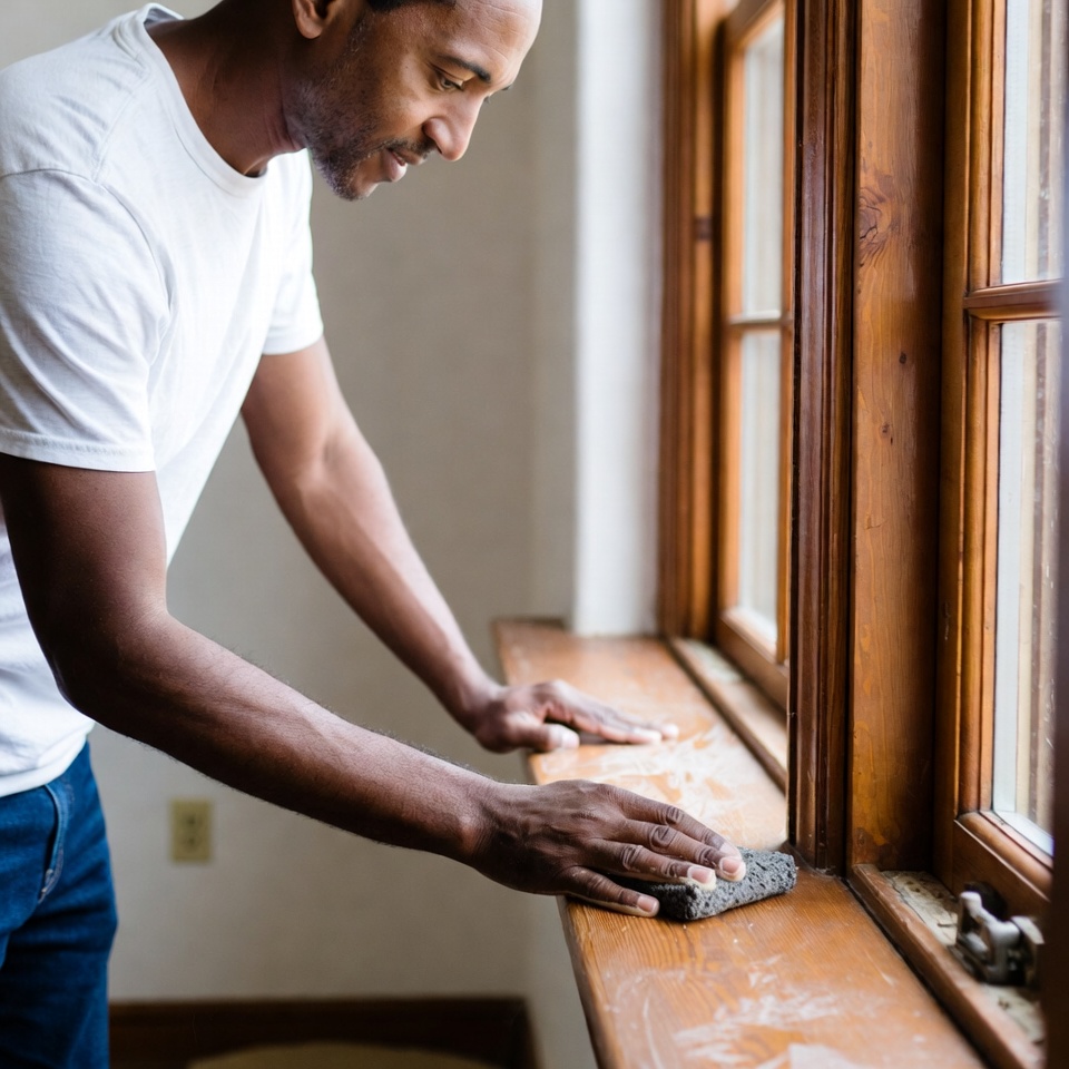 An African-American man in a white t-shirt and blue pants cleans a wooden window sill with a sponge. He leans forward attentively, focusing on scrubbing the surface near the wooden window frame. The room has light-colored walls and a window with natural light.