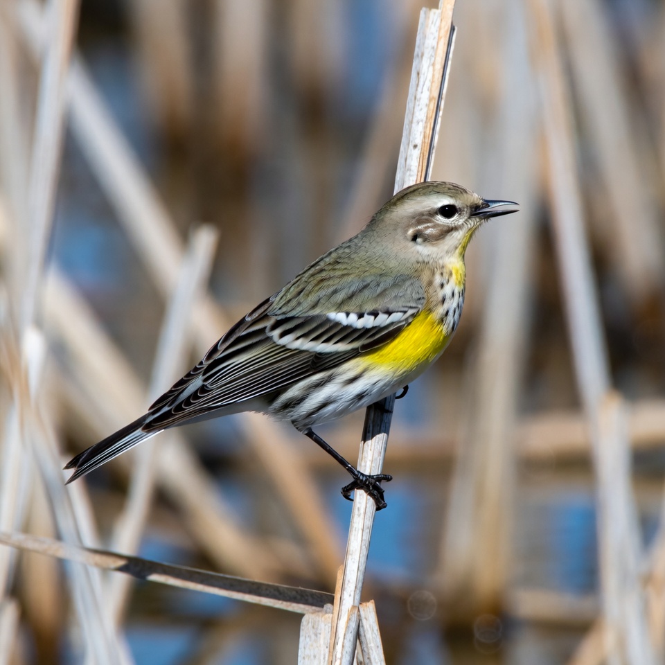 avian, bird, black legs, feathers, marsh, nature, perching bird, reed, small bird, songbird, streaked wings, warbler, wetland, wildlife, yellow bird, yellow rump, yellow-rumped warbler