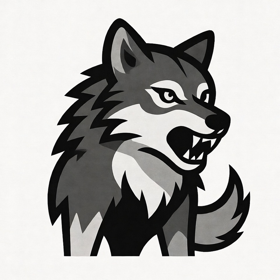 A stylized gray wolf illustration features a snarling wolf head in profile view. The wolf has sharp fangs bared, intense yellow eyes, and thick fur with black outlines. It stands against a transparent background.