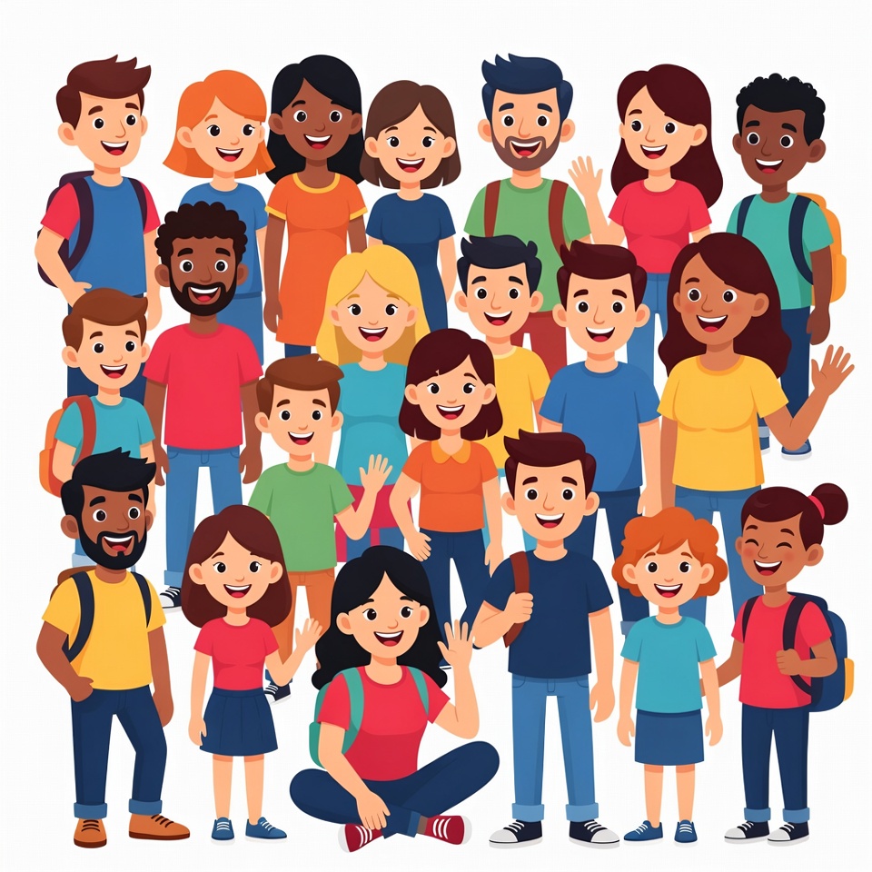 A large illustration of diverse children and young adults standing and sitting together, smiling happily. They wear casual clothes like t-shirts and jeans, with many carrying backpacks. Some wave their hands, set against a white background.