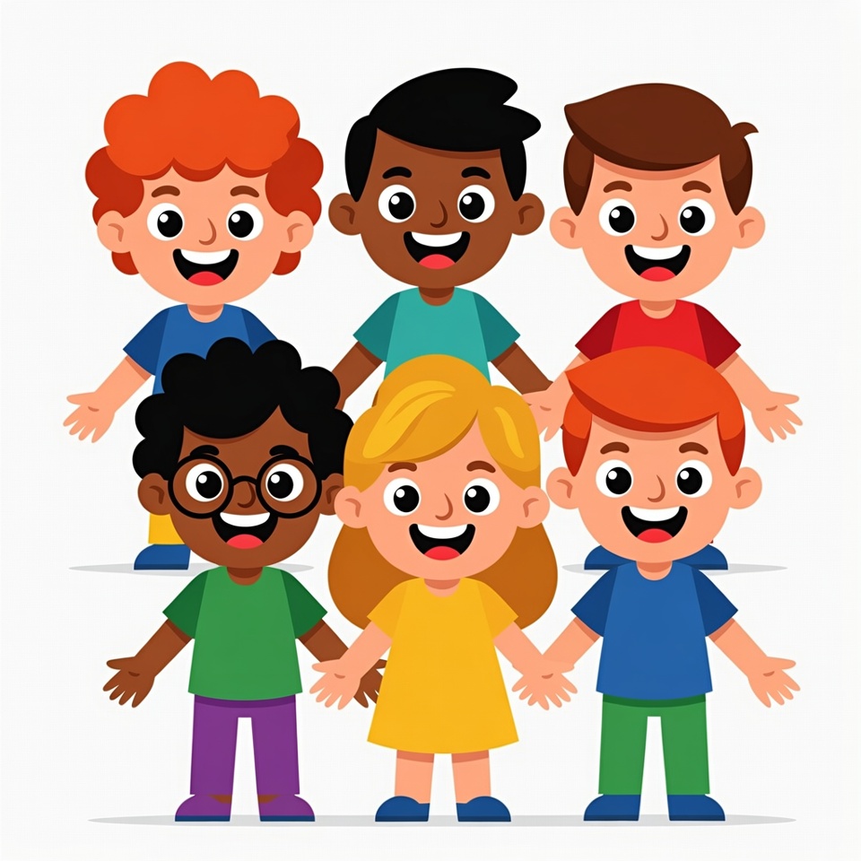 Five cheerful cartoon children stand together holding hands on a white background. They include boys with red, black, and brown hair, one wearing glasses, and a girl with blonde hair. The children wear colorful t-shirts and pants, smiling with raised arms.