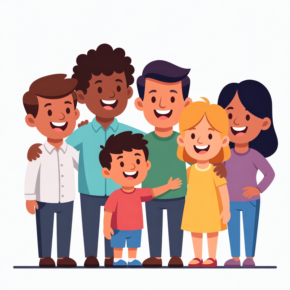 African-American, Middle Eastern, White, arms around, boy, cartoon family, casual clothes, children, clipart, colorful, diverse family, girl, group, happy family, illustration, men, multiethnic, parents, smiling, standing, together, vector art, white background, women, family