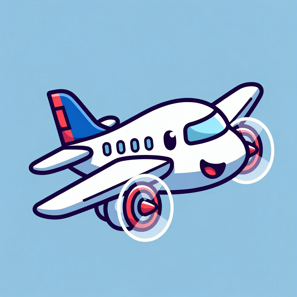 A kawaii-style cartoon airplane with big smiling eyes and rosy cheeks flies against a light blue background. It features a white body, red and blue tail accents, and shiny propeller engines. The illustration has bold outlines and vibrant colors.