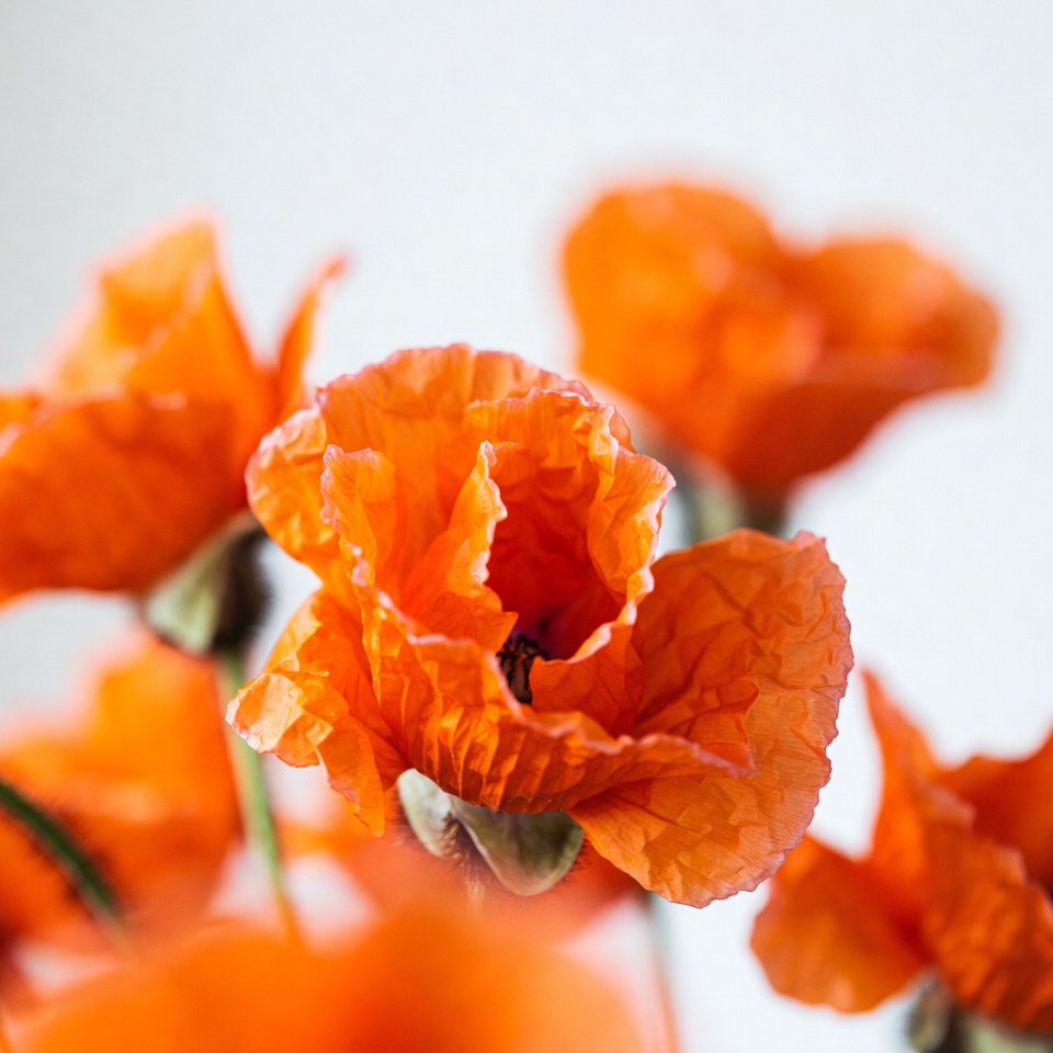 bloom, closeup, floral, flower cluster, flowers, garden flowers, green stems, macro photography, nature, orange flowers, orange poppies, ruffled petals, vibrant orange, white background, poppy flowers