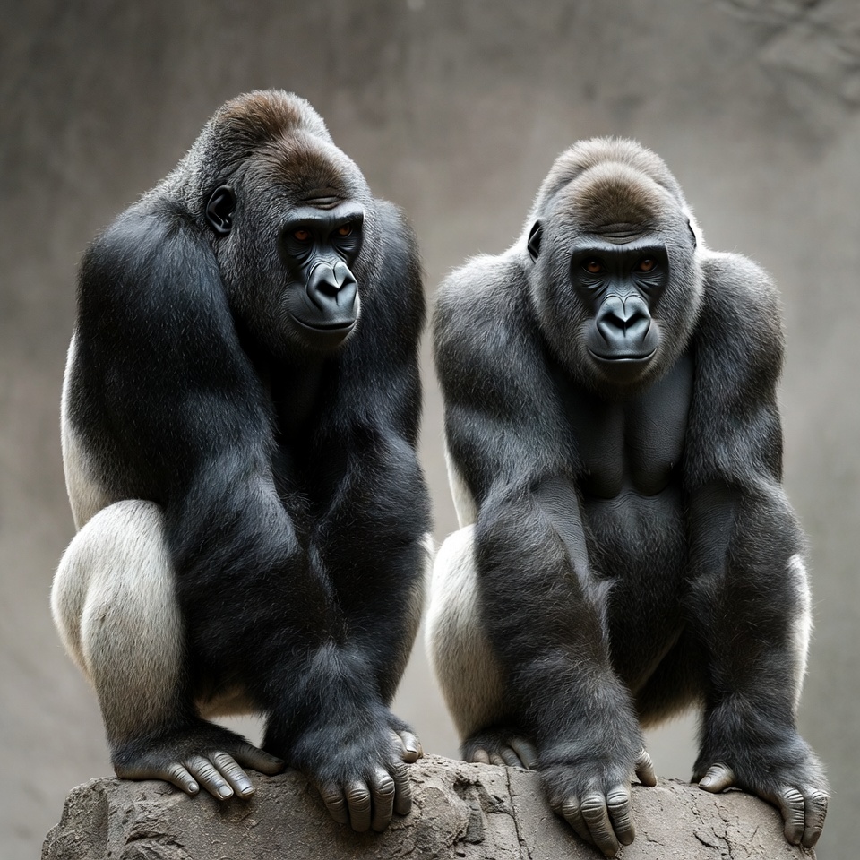 Two large gorillas with dark fur sit side by side on a rock against a blurred gray background. They have muscular builds, prominent brows, and direct gazes at the viewer. Their hands rest on the rock surface in front of them.