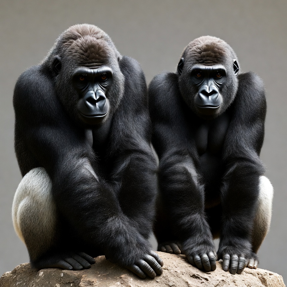 animals, ape, black fur, close-up, dark fur, gorilla pair, gray background, hands, mammal, muscular, pair, powerful, primates, red eyes, rock, silverback gorilla, sitting, sitting pose, studio photo, two gorillas, wild animals, wildlife, zoo animals, gorillas
