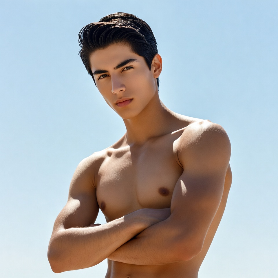 A young man with dark hair and toned muscles stands shirtless with arms crossed against a clear blue sky. He has a serious expression and defined abs. His skin is tanned and he poses confidently.
