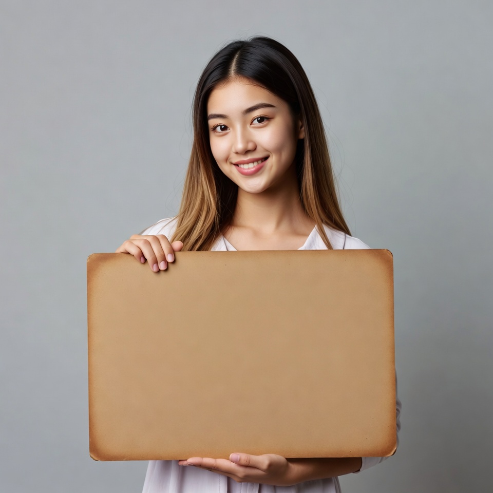 A young Asian woman with long straight hair and a smiling expression holds a large rectangular blank cardboard sign in front of her. She wears a light-colored off-shoulder top and stands against a plain gray background. Her hands grip the edges of the brown sign firmly.