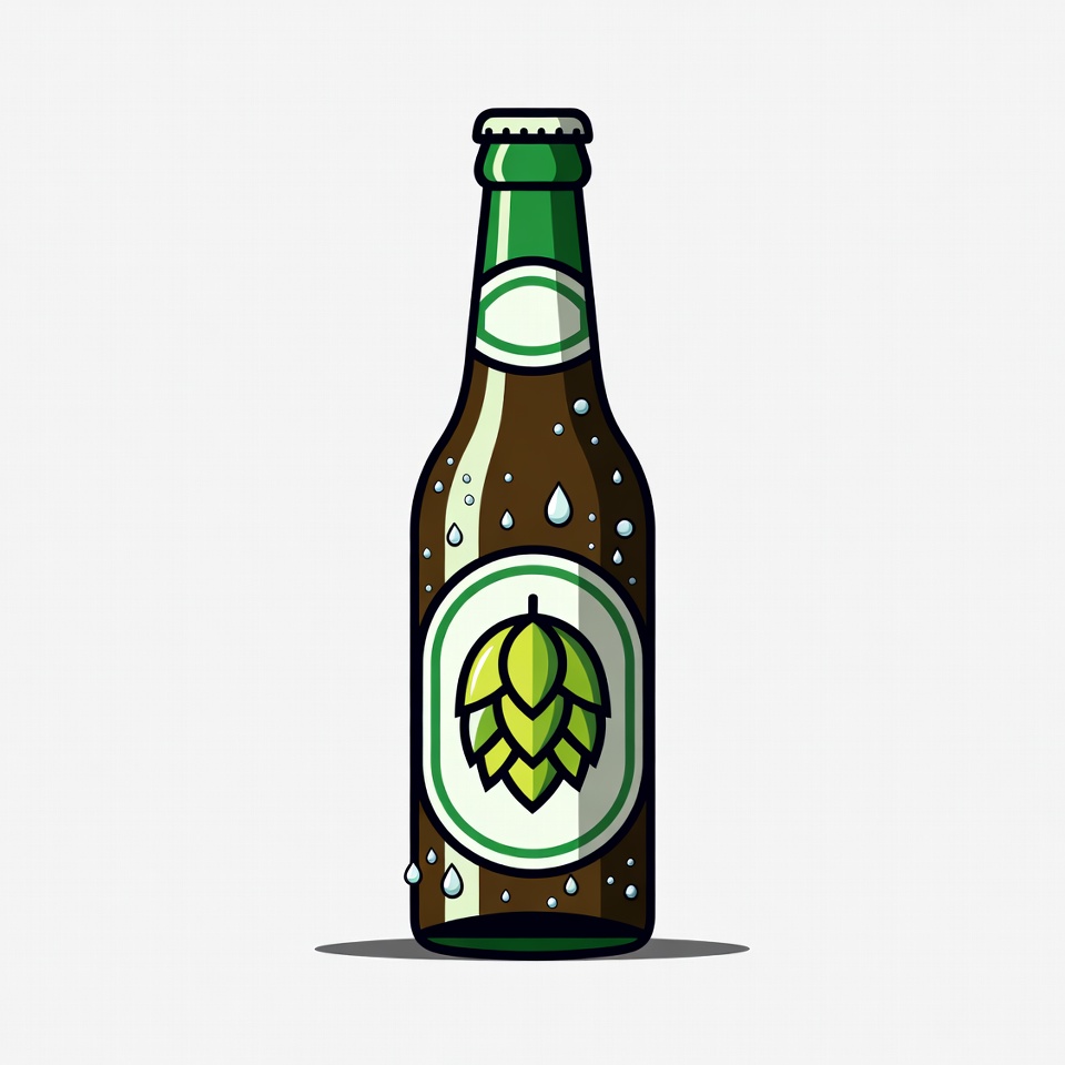 alcohol, beer, beverage, brown glass, clipart, condensation, craft beer, droplets, flat design, graphic, green cap, green label, hop design, illustration, isolated background, vector art, yellow hops, beer bottle